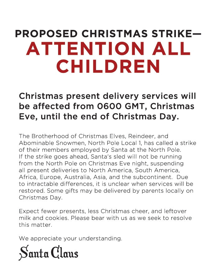 In response to the strike notice, Santa Claus has made the following announcement. [See below]