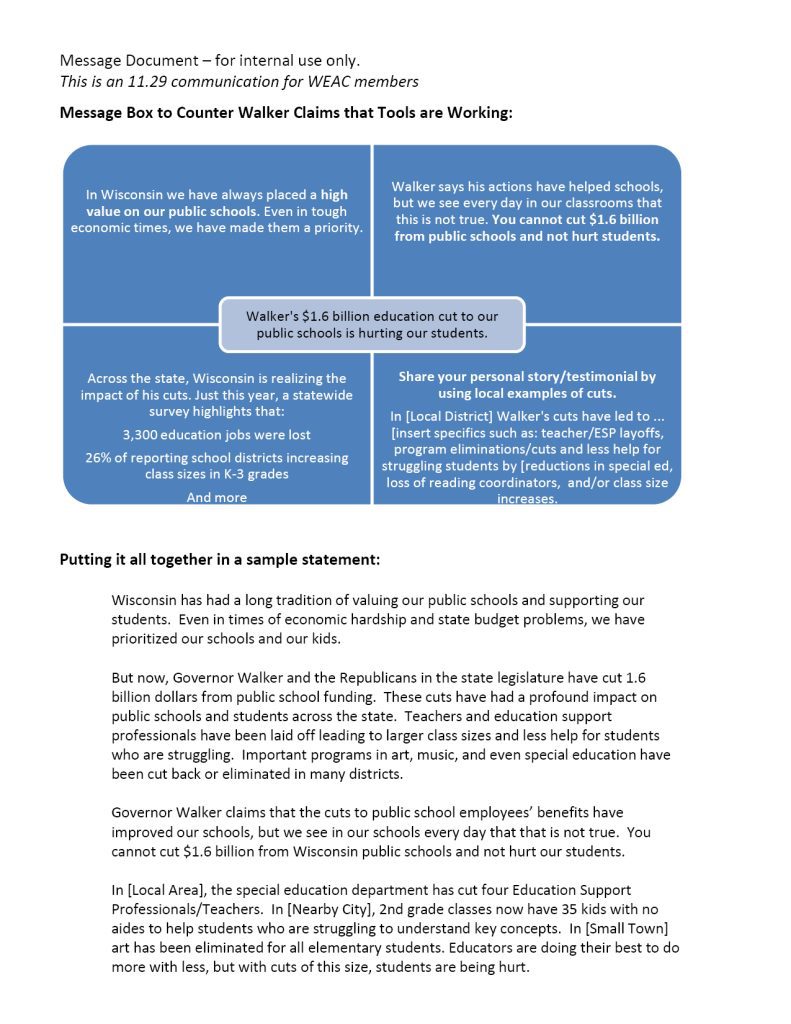 Use the “union” entity as a messenger – making this about WEAC vs. Walker causes many voters to tune out and dismiss communications as “politics as usual.” Keep a face on this issue by featuring members/parents to tell about the impact of cuts.