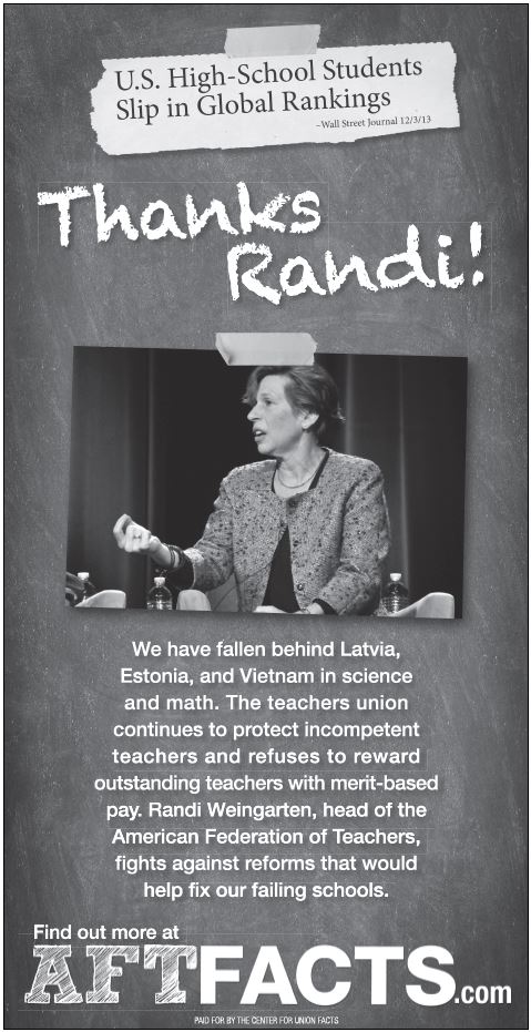 Washington, D.C. – As part of its ongoing campaign against the negative effects of teachers unions on education in the United States, today the Center for Union Facts is running a full-page ad in The New York Times calling attention to the contributions of the American Federation of Teachers to America’s academic decline. The ad focuses on the fact that instead of rewarding excellent teachers with higher pay, Randi Weingarten and the AFT protect incompetence in the classroom by opposing merit-based pay at every turn.