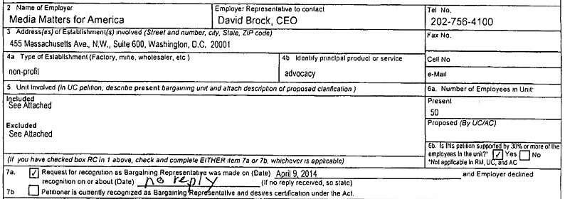 The petition shows that SEIU made a request for voluntary recognition as the exclusive bargaining agent for all 50 of Media Matters’ non-supervisory (unionization eligible) employees. Brock’s response? “No reply.”