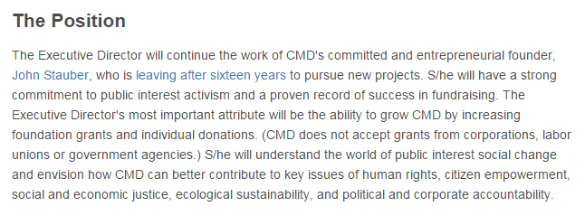 CMD once had a more restrictive contributions policy, proudly asserting as recently as 2010 that it “does NOT accept corporate, labor union or government grants.” In a 2009 posting for the group’s top job, the organization claimed, “CMD does not accept grants from corporations, labor unions or government agencies,” as in the screenshot below.