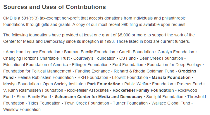 Using the Internet Archive “Wayback Machine,” which caches pages on the internet, we can determine when Center for Media and Democracy changed its stated position on its “Financial Supporters” page (which no longer exists, having been rolled into an “About Us” page).