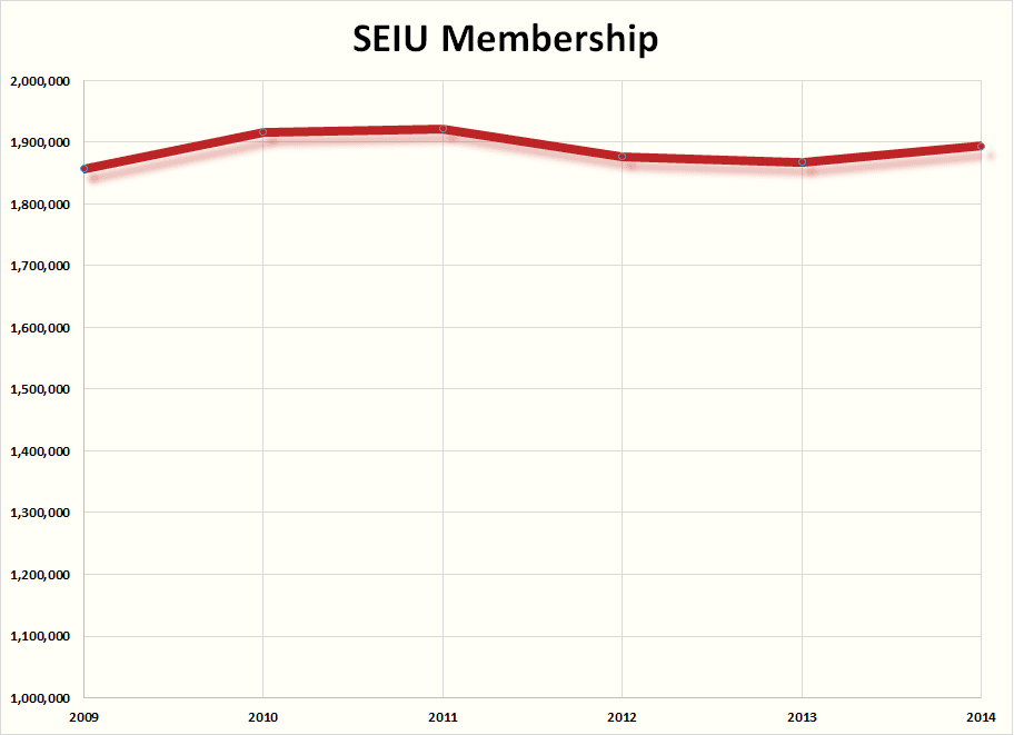 Based on a look through SEIU’s press releases of late, though, that growth has stopped. They aren’t bragging about membership growth or a burgeoning union movement anymore, choosing instead to go quiet on the issue. And the numbers confirm it: SEIU’s own membership has been effectively stagnant since it absorbed Workers United (formerly a UNITE Here property) in 2009.