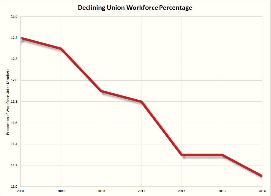 Meanwhile, union density nationwide—the proportion of the workforce that consists of union members—is continuing its downward trend.