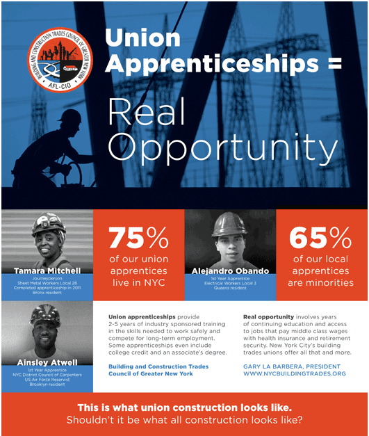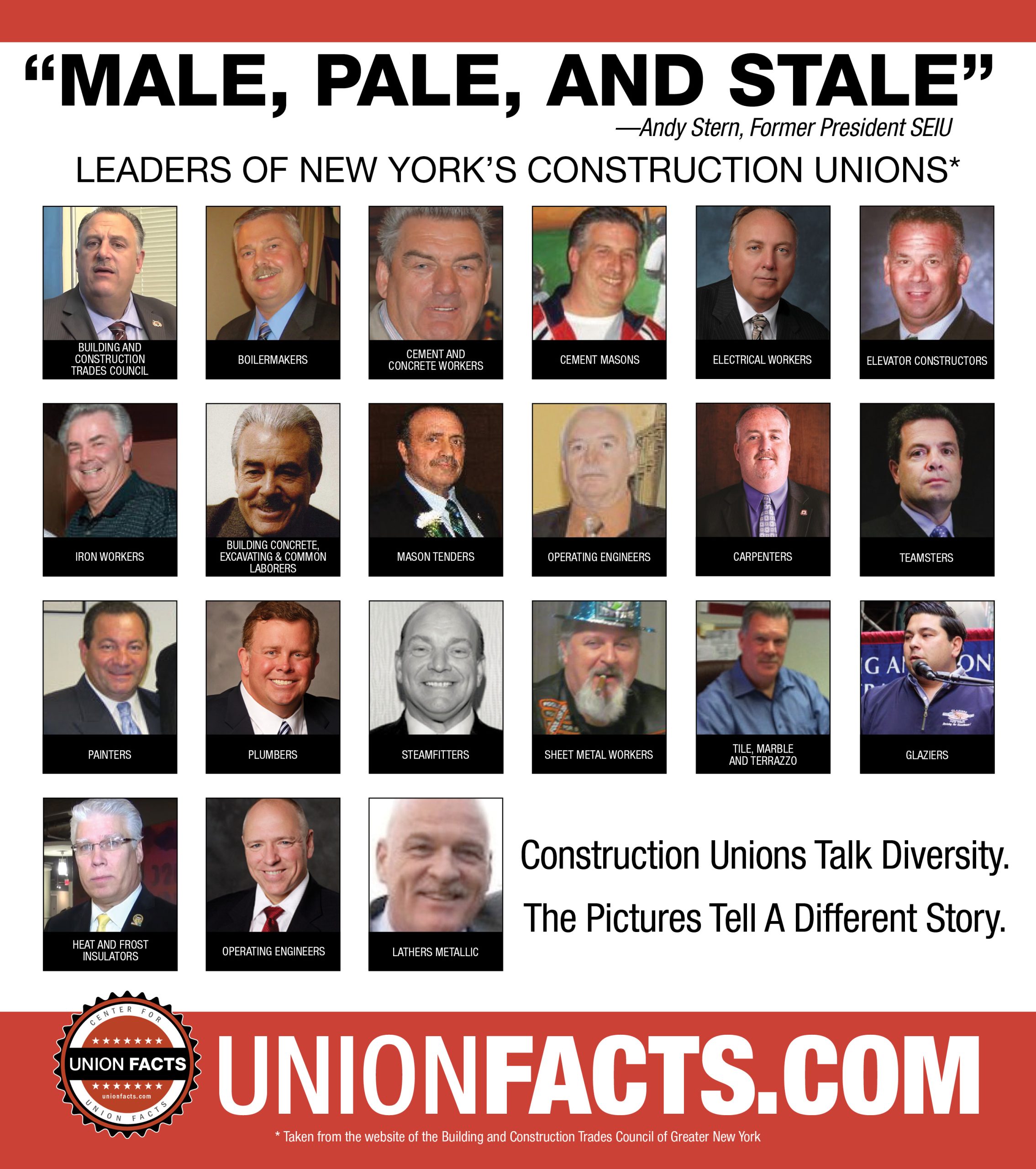 A review of the leadership of the BCTC, which represents the city’s major construction unions, isn’t promising. As we note in an advertisement in the New York Daily News, the union leadership is historically exclusively “male, pale, and stale”—older white dudes as famously noted (regarding national unions) by former SEIU President Andy Stern.