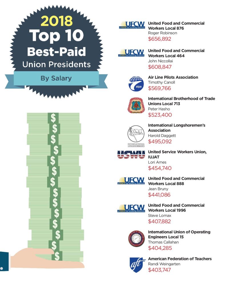 The AFL-CIO’s cherry-picking changes the subject—from Big Labor’s own income inequality crisis. According to Bureau of Labor Statistics data, the average U.S. “chief executive,” which includes small business owners, earned $196,050 in gross salary last year—nowhere near the AFL-CIO’s $13.94 million figure. A review of union financial disclosures filed with the Labor Department found that dozens of union presidents make more than the average CEO. In fact, 146 union presidents earn a higher gross salary than the average CEO ($196,050). Three of them make more than $500,000 in base salary alone. You can see the top-10 salary earners here: