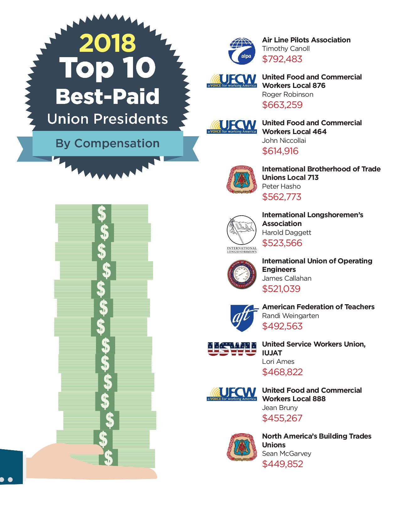 Of course, union officials can also expect much more than a salary, including travel expenses and other business disbursements. In 2017, 193 union presidents earned more than $196,050 in total compensation. Timothy Canoll, president of the Air Line Pilots Association, made nearly $793,000. He was joined by five other union presidents who collected well over $500,000. Even AFL-CIO President Richard Trumka, whose labor group put out the Executive Paywatch report, earned more than $315,000 in 2017—far more than a typical CEO.