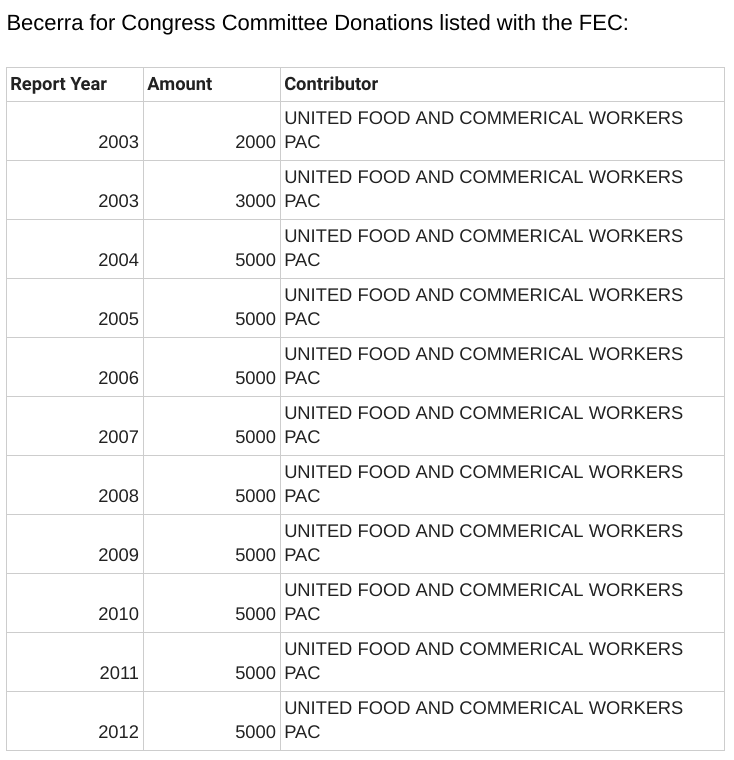 Let’s start with California Attorney General Xavier Becerra. Before he became AG, Becerra had a long stint as a Congressman. According to FEC filings and data available on OpenSecrets.org, Becerra received a total of $129,000 from the United Food and Commercial Workers (UFCW) during his time in the House of Representatives.