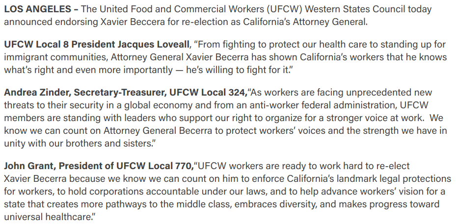During his run for AG, UFCW PACs donated a total of $59,700 to Becerra, including donations to his 2022 campaign. A list of re-election endorsements from UFCW leaders (below) speaks to Becerra’s popularity with the union. (It’s worth noting that the UFCW is one of the key unions funding Working Washington — a worker center dedicated to organizing workers in the gig economy.)