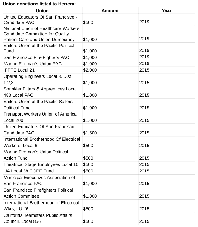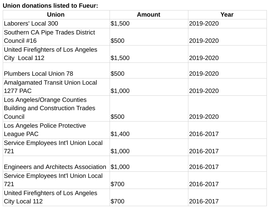 Across his campaigns for San Francisco city attorney, Dennis Herrera has received $17,000 from labor unions, including the IBEW, Teamsters, and the Transport Workers Union of America. Similarly, Los Angeles City Attorney Mike Fueur has received over $10,000 from labor unions during his campaigns for city attorney, including donations from the SEIU and the Los Angeles Building and Construction Trades Council.
