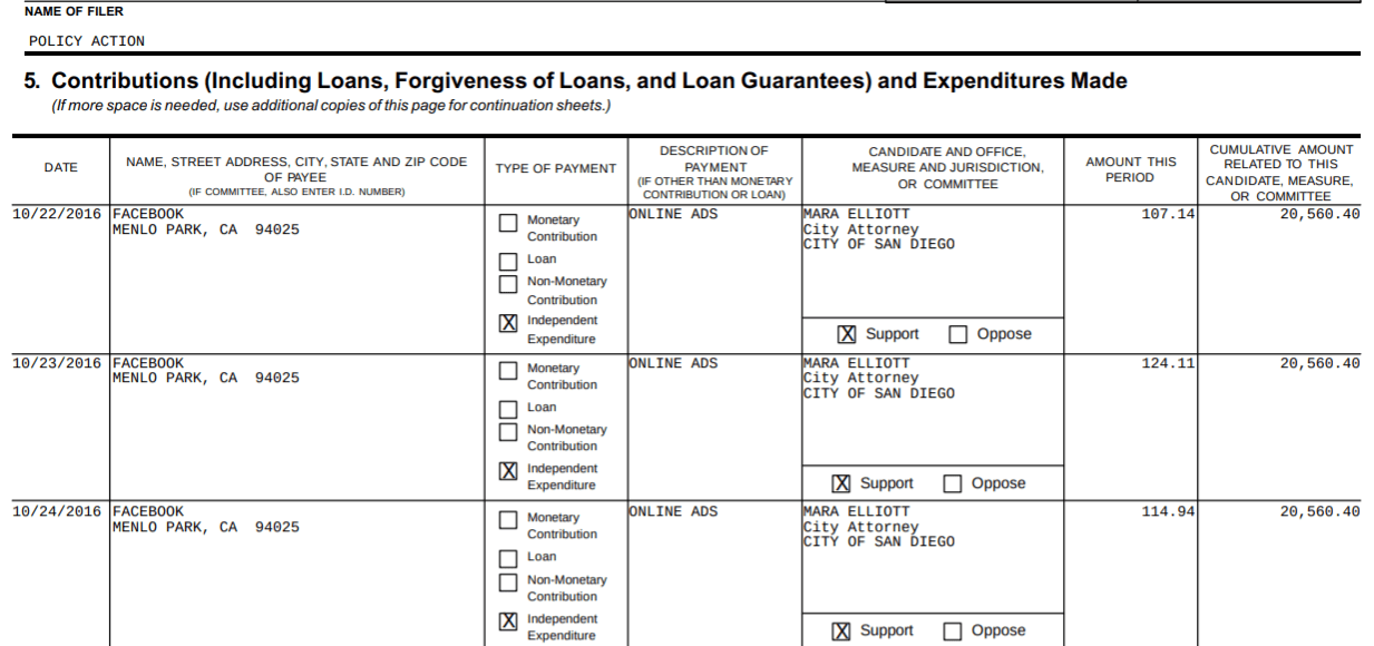 San Diego City Attorney Mara Elliott, who filed her own lawsuit against a gig company last year, received $162,407 in independent expenditures from labor unions during her 2016 campaign. She also received over $20,000 from Policy Action PAC (shown below)– a PAC that received $5,000 from SEIU Local 221 that same year. Unions also spent $28,001 in independent expenditures against Elliott’s opponent. So far, Elliott’s 2020 campaign has been endorsed by the Democratic Party of San Diego and the San Diego-Imperial Counties Labor Council, which receive significant support from UFCW locals.