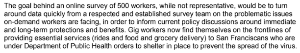 The Santa Cruz report originated from a project sponsored by a city commission in San Francisco–the Emerging Mobility Services Labor Study. At the outset, the study sought to investigate “the [gig] companies’ labor models” and conduct “the largest survey of demand workers in the U.S.” The labor group Jobs With Justice was “leading” the project–both “survey outreach and field operations”– according to a description by the city administrator. (Jobs With Justice is a labor group funded by unions that, among other goals, focuses on organizing gig workers.) UC Santa Cruz researcher Chris Benner, who’s worked extensively with unions in the past, was brought on to provide assistance.