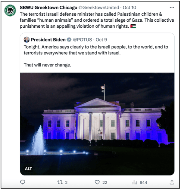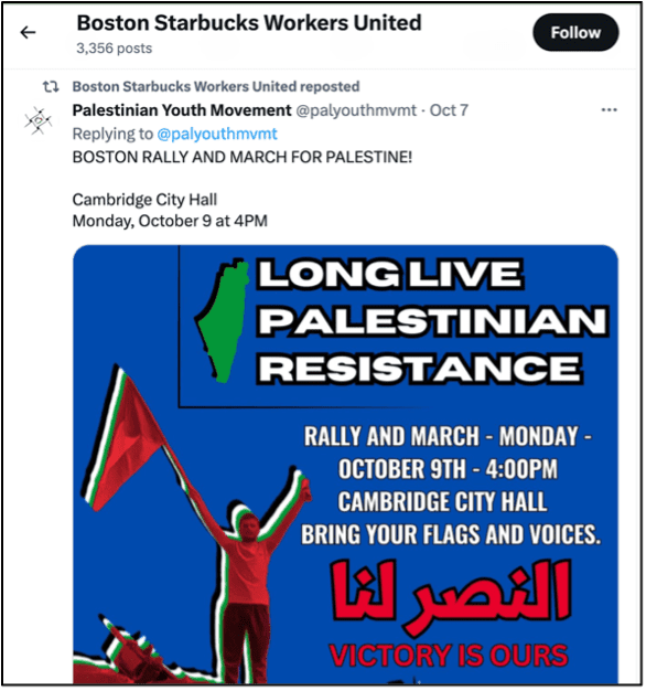 In the wake of recent attacks on Israel by Hamas terrorists, Starbucks Workers United and its organizers have taken to X – formerly known as Twitter – to express their defense of the attacks. The union’s social media accounts spanning from Boston to Chicago have focused on denouncing Israel and defending acts of terrorism.