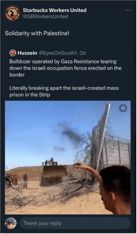 The controversy at Starbucks Workers United began when the group’s main account posted a supporting message on a Hamas propaganda image breaking through a Gaza Strip fence. The post has since been deleted.