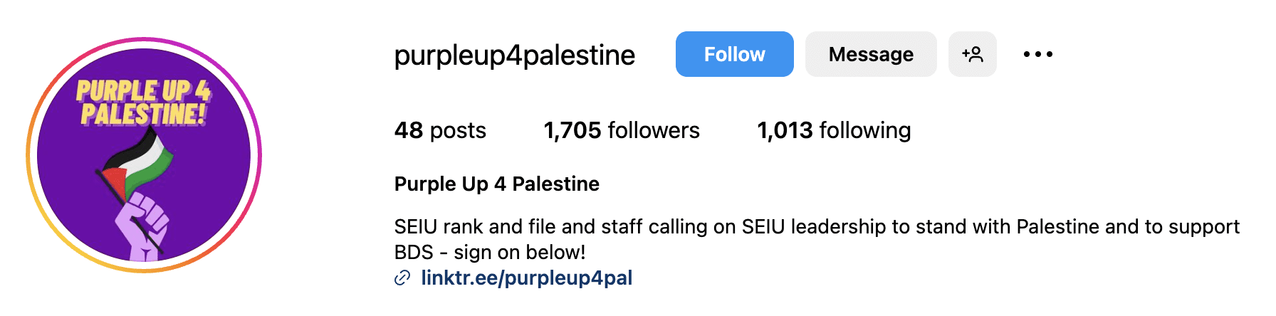 Purple up 4 Palestine also has an official Instagram account where slogans like “Stand Against Genocide” and “Hands off Yemen” are routinely used. The account is followed by the official Instagram pages for the SEIU Local 140 (SEIU 503, Portland), SEIU Healthcare Pennsylvania, Nurse Alliance of SEIU California, and SEIU Local 121RN (Southern California).