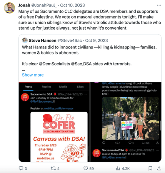 Jonah Paul — a self-described officer of the SEIU 1000 out of California — also defended the Palestinian cause in the wake of the Hamas terrorist attack. Paul vocally critiqued an X Post for calling out Hamas terrorism and claimed that he is an advocate of a “free Palestine” and not just when “it is convenient.”
