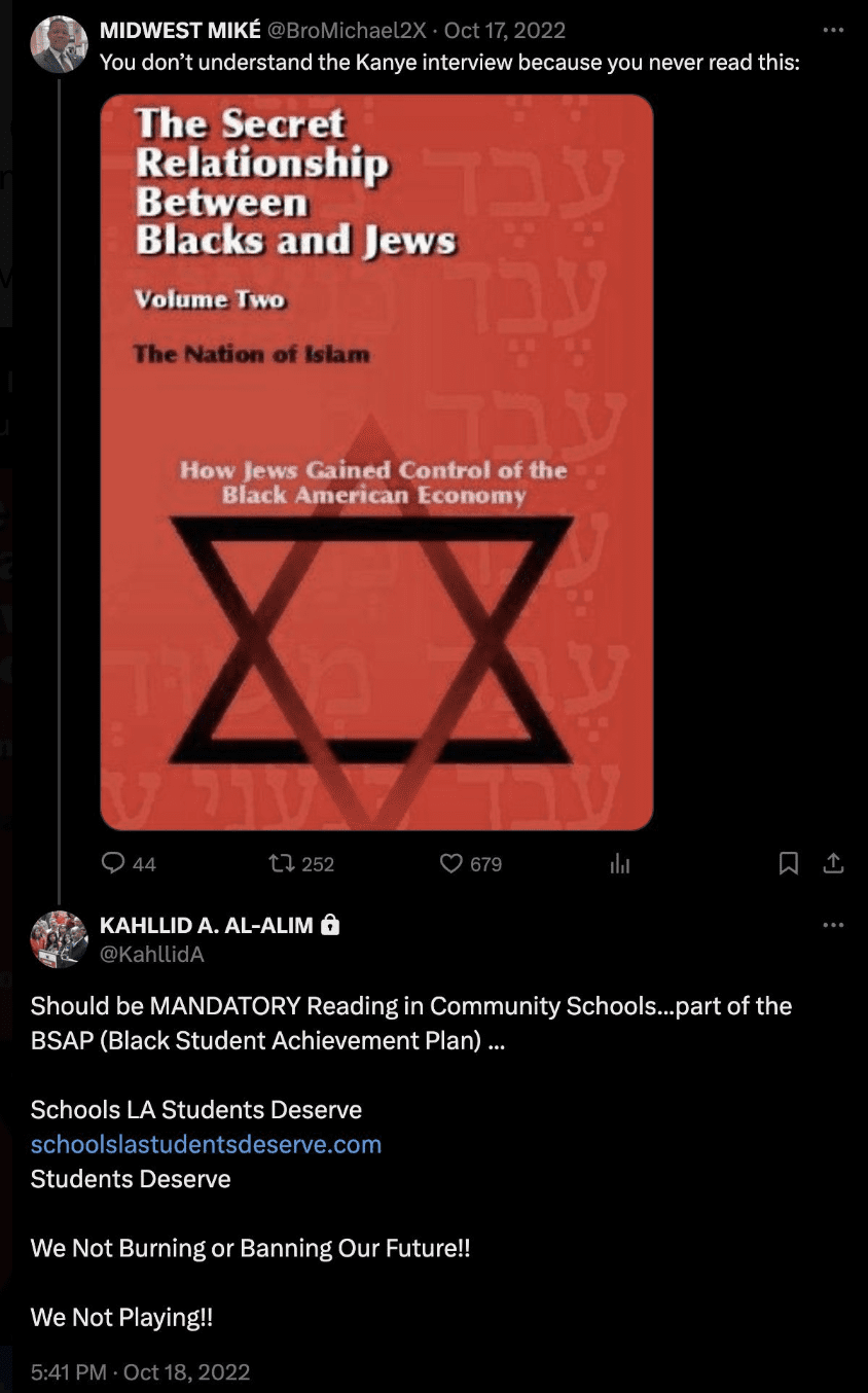 Kahllid Al-Alim, a candidate for the Los Angeles Unified School District Board and an SEIU 721 member, claimed in an Oct. 18, 2022, X post that the anti-Semitic book The Secret Relationship Between Blacks and Jews should be “MANDATORY Reading in Community Schools.”