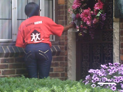This was sort of a random discovery, but I stumbled across this great photo of a UNITE HERE door knocker apparently peeking through the blinds of some poor person’s house during a “labor walk” for the deceptively-named Employee Free Choice Act.