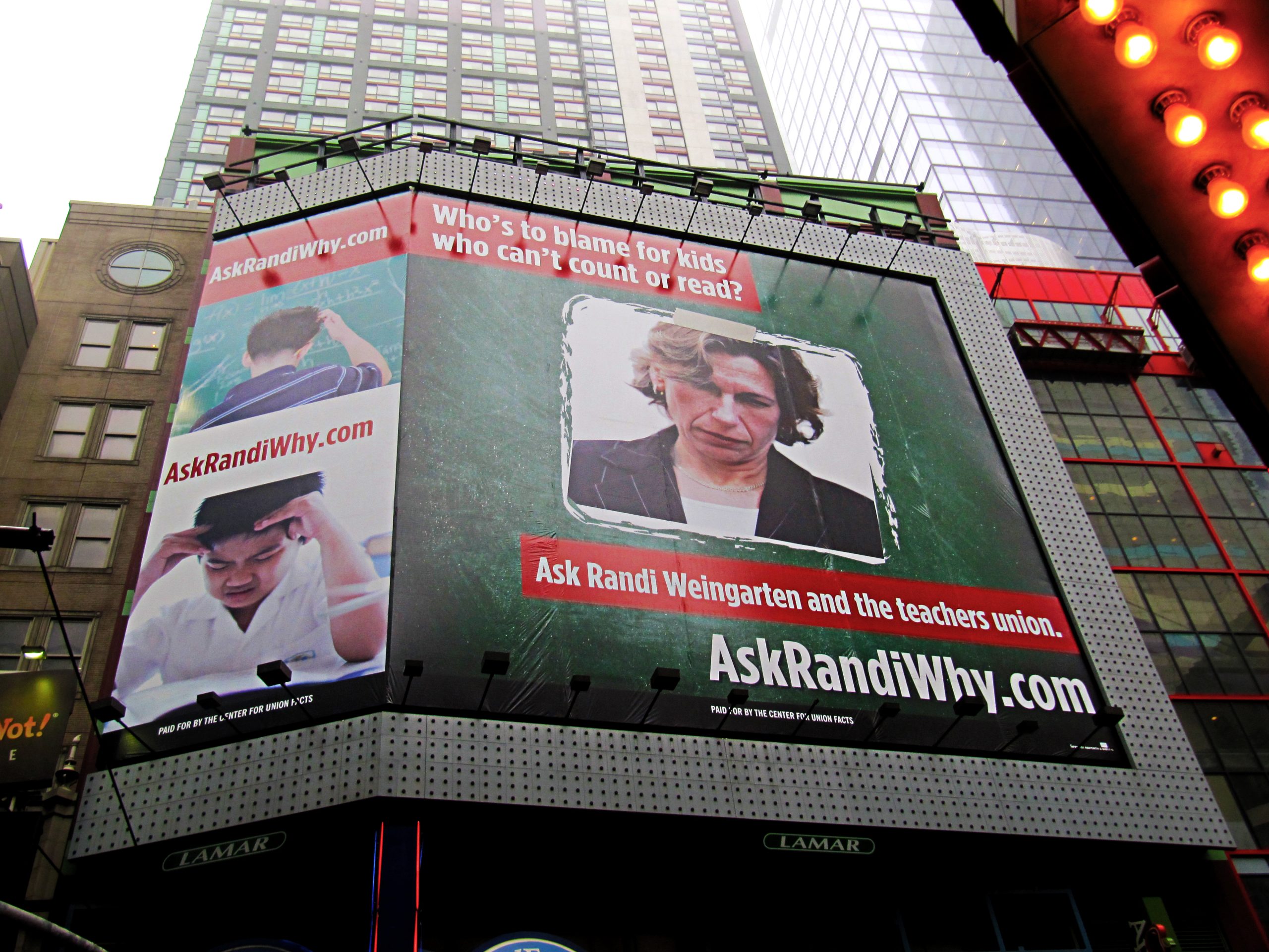 Washington, D.C. – As part of its ongoing campaign against the toxic effects of teacher unions on U.S. education, the Center for Union Facts has placed a billboard just off Times Square calling out American Federation of Teachers (AFT) President Randi Weingarten for contributing to America’s education decline. The recently released results of the OECD’s triennial Program for International Student Assessment showed that American students slipped again relative to their international peers in the subjects of math, science, and reading.
