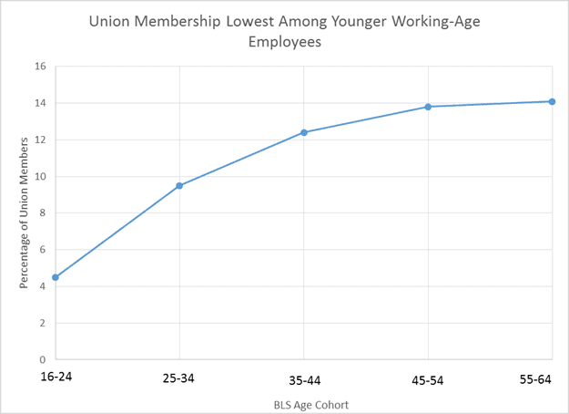 Union bosses are nailing their hopes to demographic changes, touting a finding that young people favor unions more highly than their elders. But a closer look at the numbers suggests that might actually be a problem, because young people aren’t joining unions in any large numbers. Bureau of Labor Statistics data on how many employees of various ages are union members shows that the rate of unionization among working-age (16-64 year-old) people closely tracks their age—meaning that younger workers are least likely to be union members, and those about to reach retirement age are most likely.
