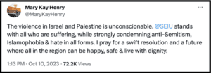 The union was forced to save face by firing its Connecticut executive director’s for claiming “our enemies are not in Gaza, our comrades are in Gaza.” The firing came just days after SEIU President Mary Kay Henry issued a poorly worded statement that failed to mention the deaths of over one thousand Israelis.