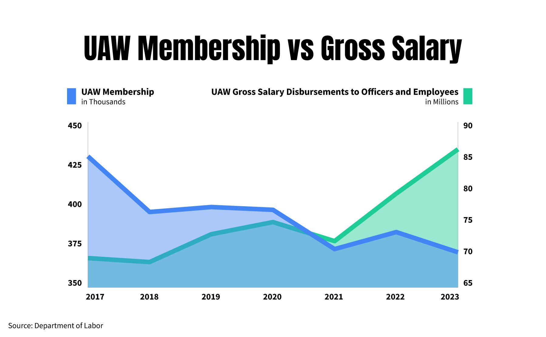 A careful analysis of the UAW’s most recent financial filings with the Department of Labor reveals that the union spent over $86 million on gross salary disbursements to its officers and employees in 2023, while its membership fell to the lowest level since 2009.